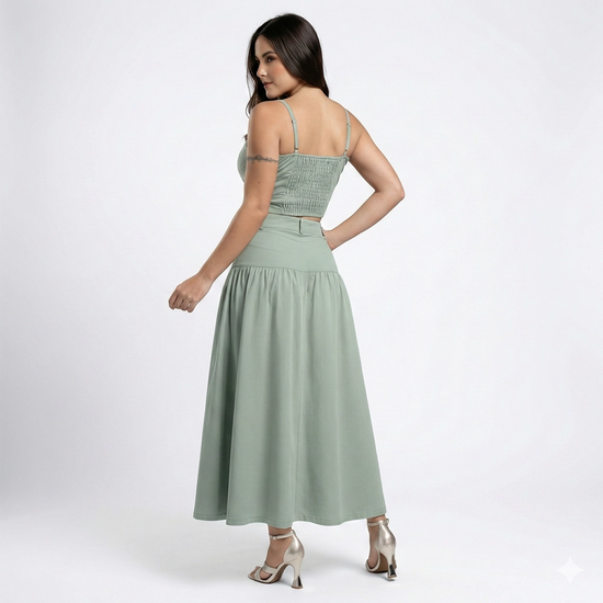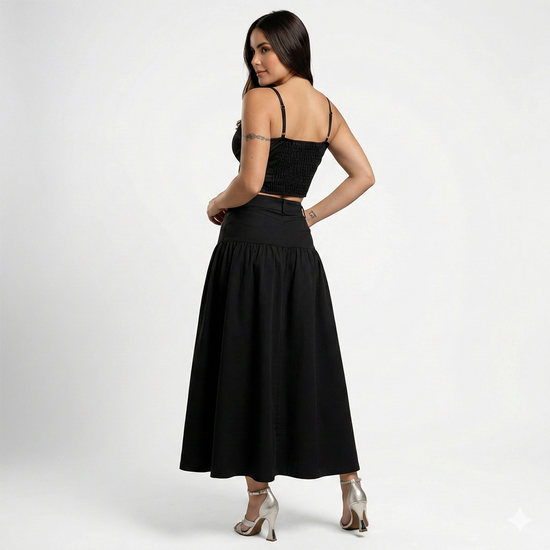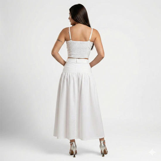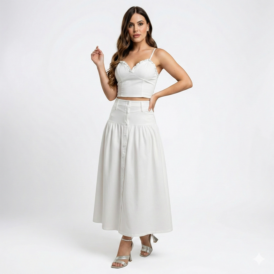Romántico, delicado y atemporal. El Set Roselle está compuesto por un top de tirantes finos con delicados detalles en el escote que realzan el busto de forma sutil y femenina, acompañado de una falda larga de tiro alto que estiliza la silueta y aporta movimiento gracias a su caída fluida.