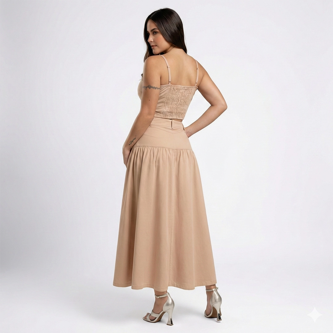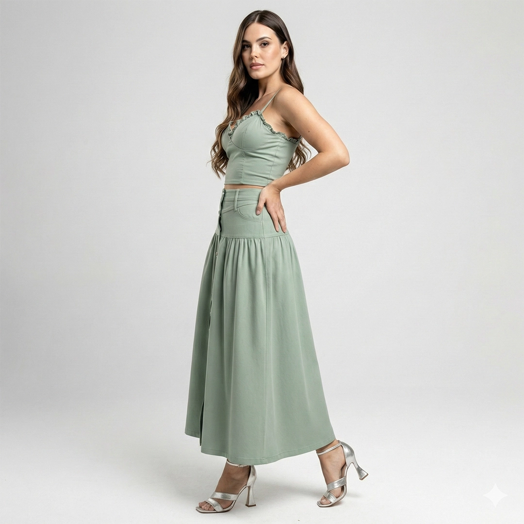 Perfecto para eventos de día, brunches, celebraciones especiales o salidas casuales elevadas, este set puede usarse junto o por separado, ofreciendo múltiples posibilidades de estilismo.