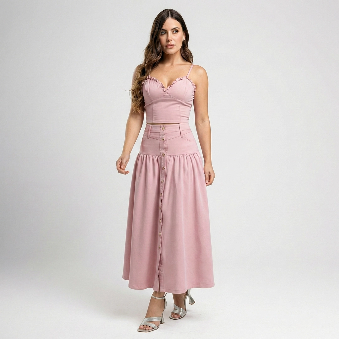 La falda incorpora botón frontal decorativo y un corte suave que brinda comodidad y elegancia en cada paso. Su tono rosado aporta un aire fresco y cómodo, ideal para looks de día que buscan destacar con delicadeza.