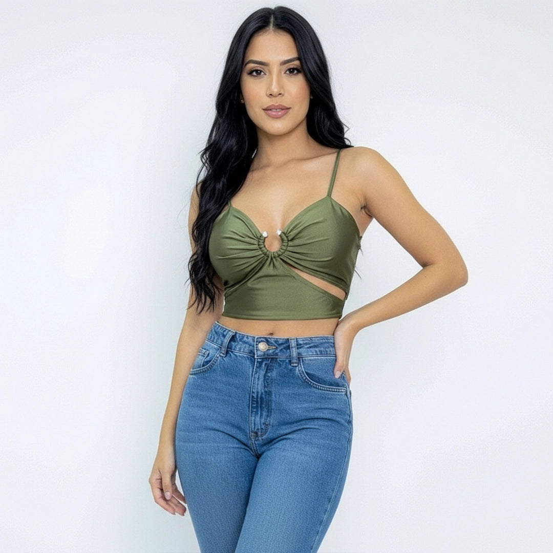 Atrévete a destacar con el Top Noa, una prenda con carácter y elegancia. Su diseño ajustado en microfibra suave se adapta perfectamente al cuerpo, mientras que el detalle de argolla frontal con abertura lateral le aporta ese toque atrevido y glamuroso que eleva cualquier outfit.