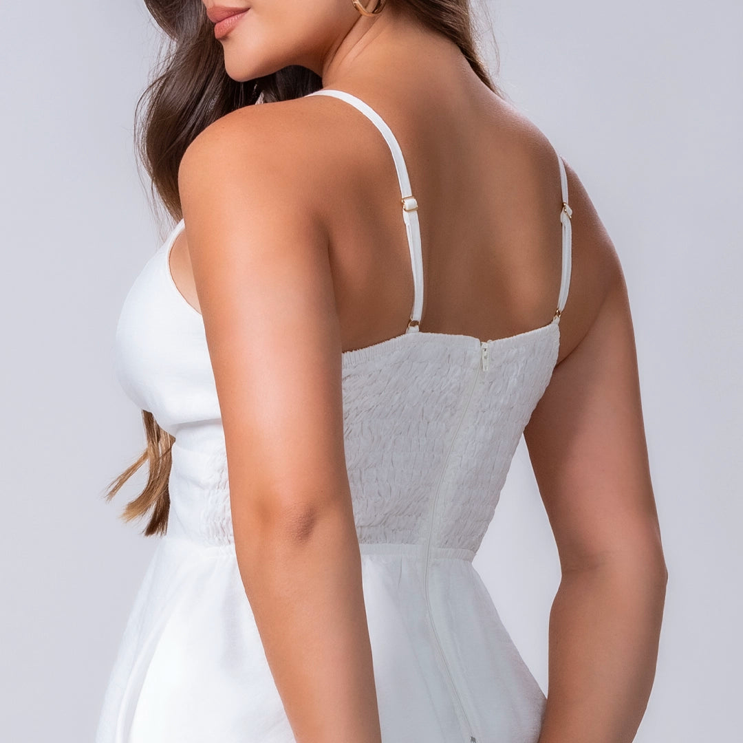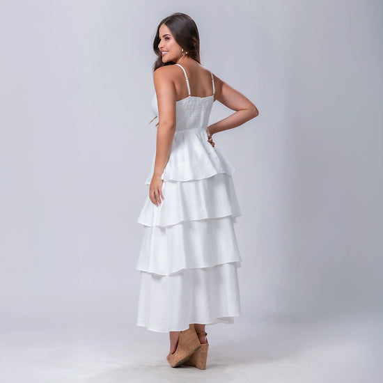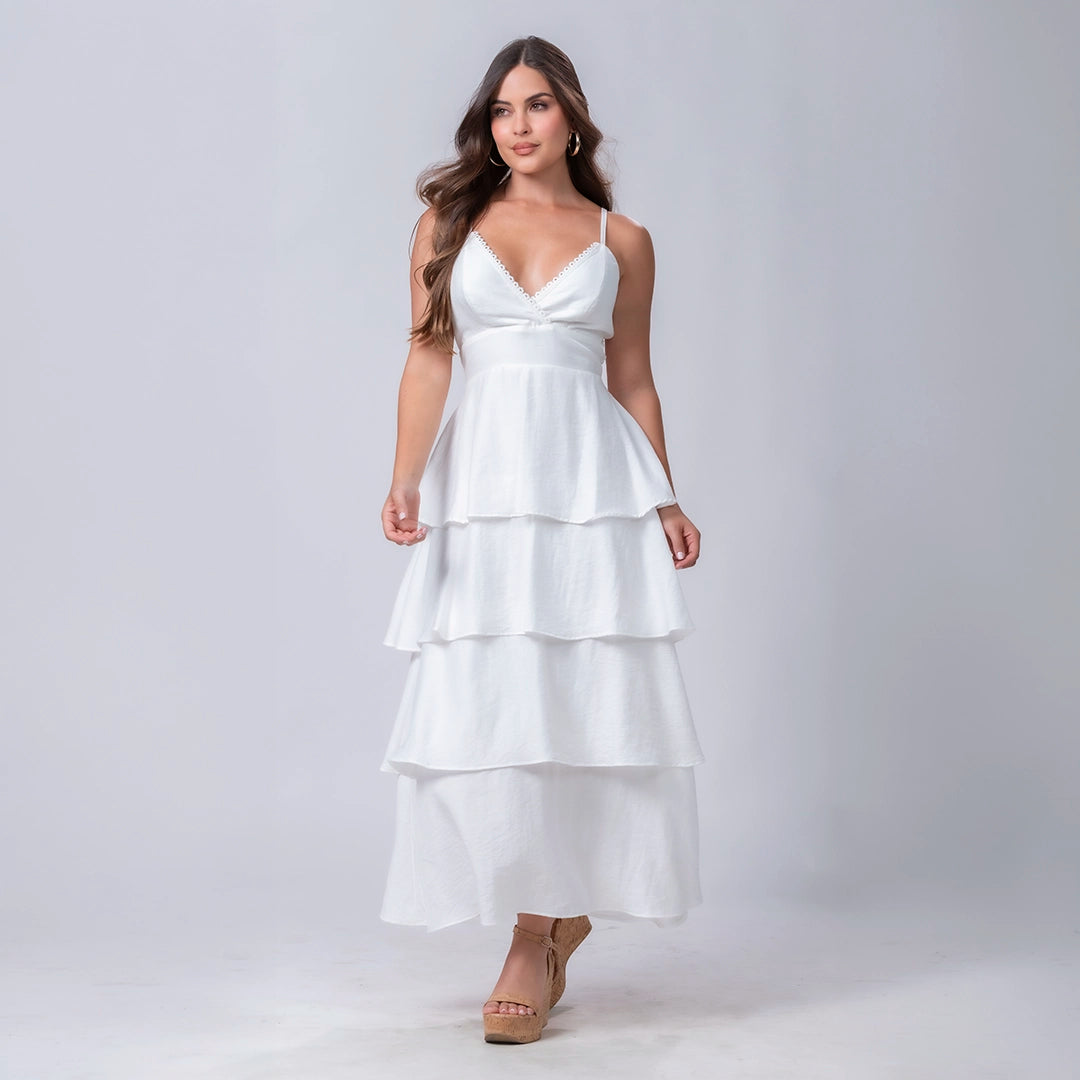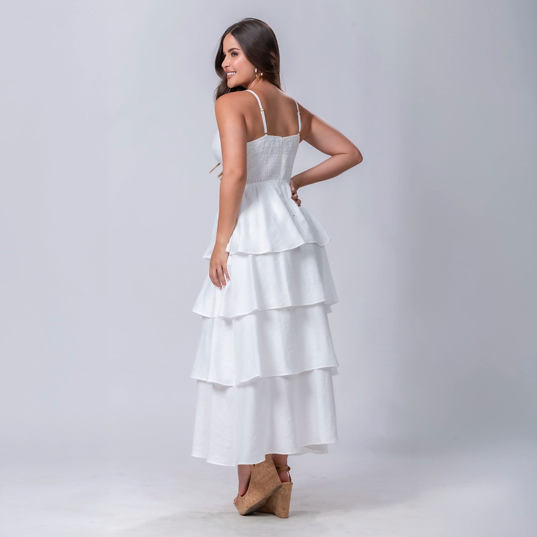 La falda se compone de capas en caída suave, creando volumen ligero y un movimiento fluido al caminar. Su estructura en niveles le da un aire romántico y bohemio, ideal para climas cálidos, eventos de día o fiestas de blanco.