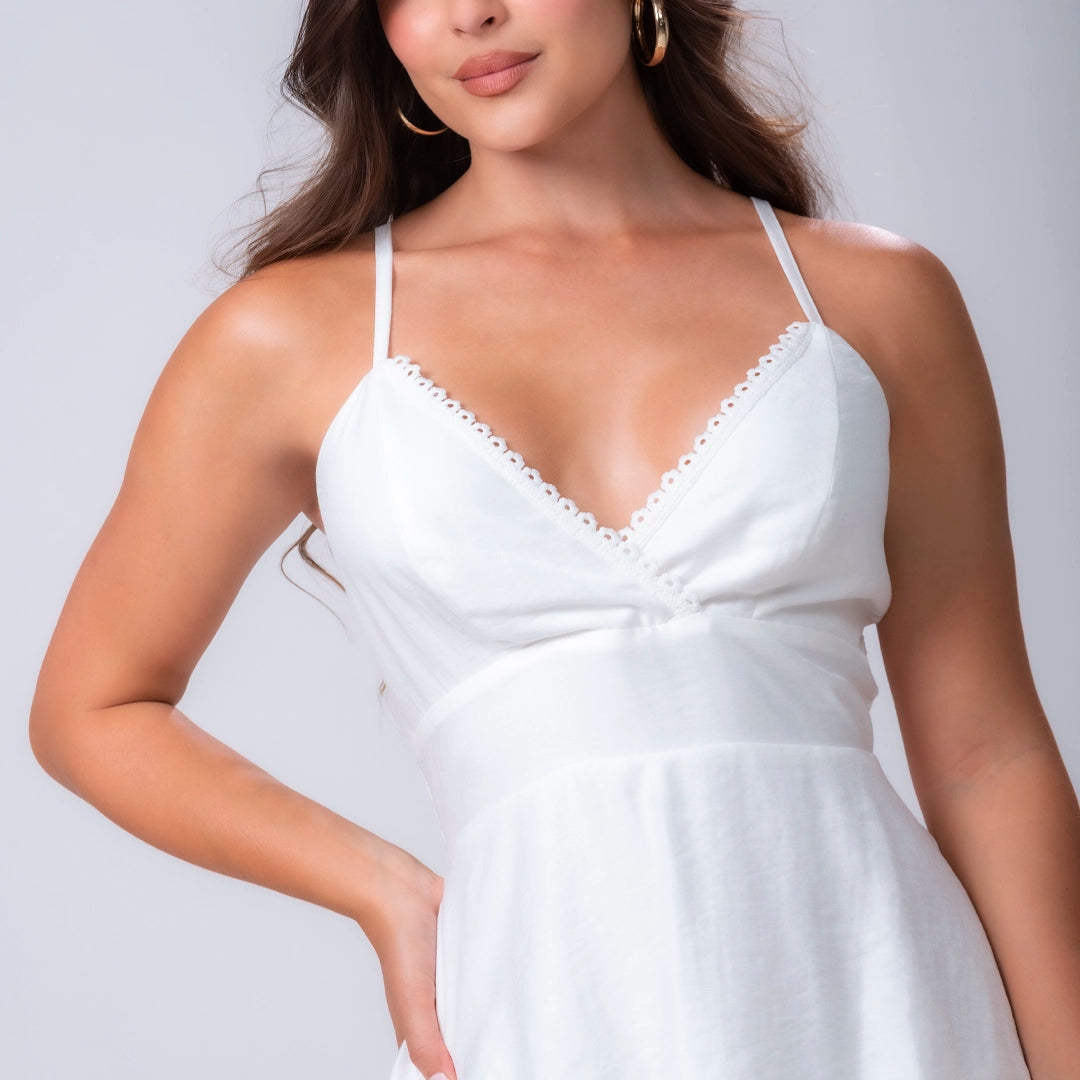 Un diseño que combina frescura, movimiento y elegancia natural. Este vestido largo destaca por su silueta femenina con delicados tirantes delgados y un escote en V con detalles sutiles, que estiliza la parte superior y aporta un toque delicado.