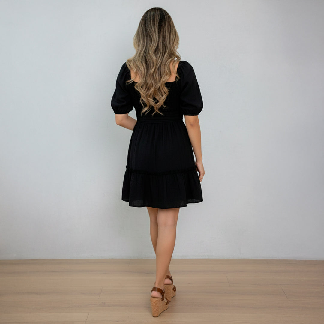 Este vestido corto presenta un elegante escote cuadrado que resalta tus hombros con gracia y estilo. Confeccionado con telas de alta calidad, ofrece un ajuste favorecedor que realza tu figura con elegancia. El escote cuadrado añade un toque de sofisticación y modernidad al vestido, creando un look versátil y chic.