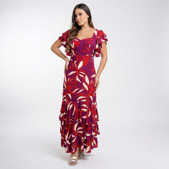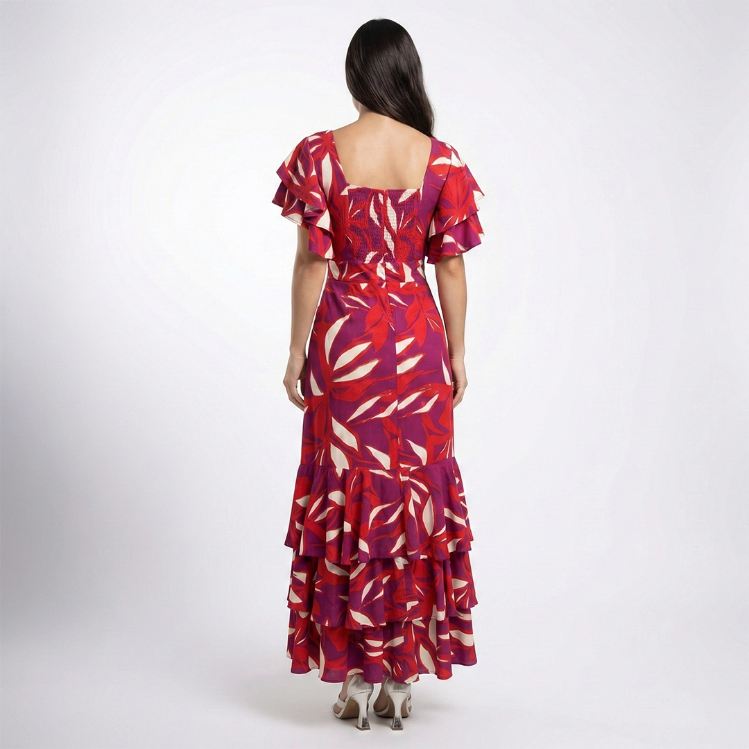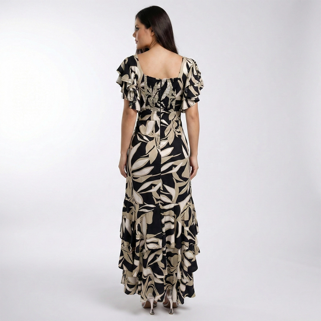 Natural, sofisticado y lleno de movimiento. El Vestido Livia está elaborado en tela chalis estampada, una fibra liviana y fresca que ofrece una caída fluida y una sensación suave al contacto con la piel. Su diseño largo con falda en tiempos y delicados volantes aporta dinamismo y elegancia en cada paso.
