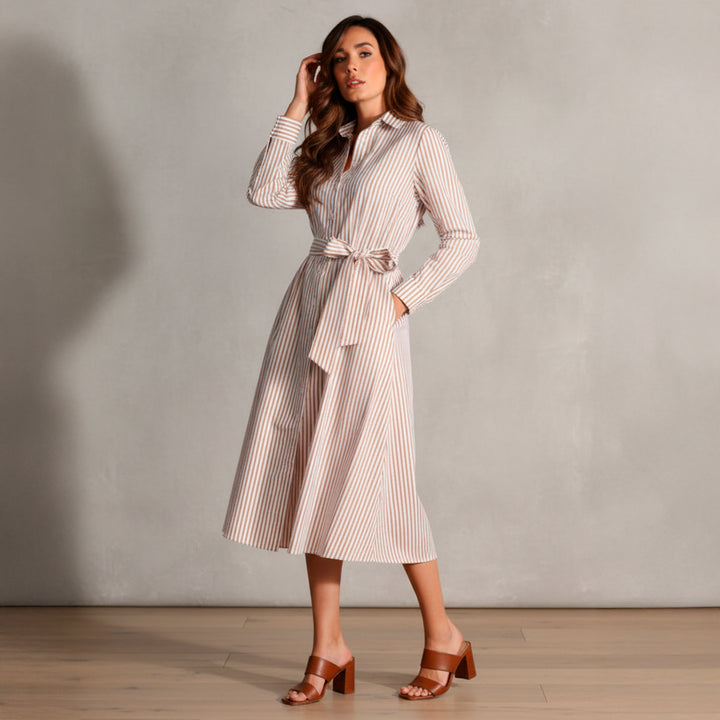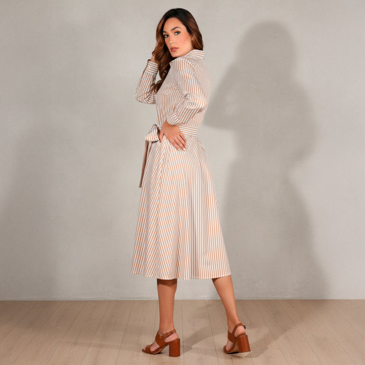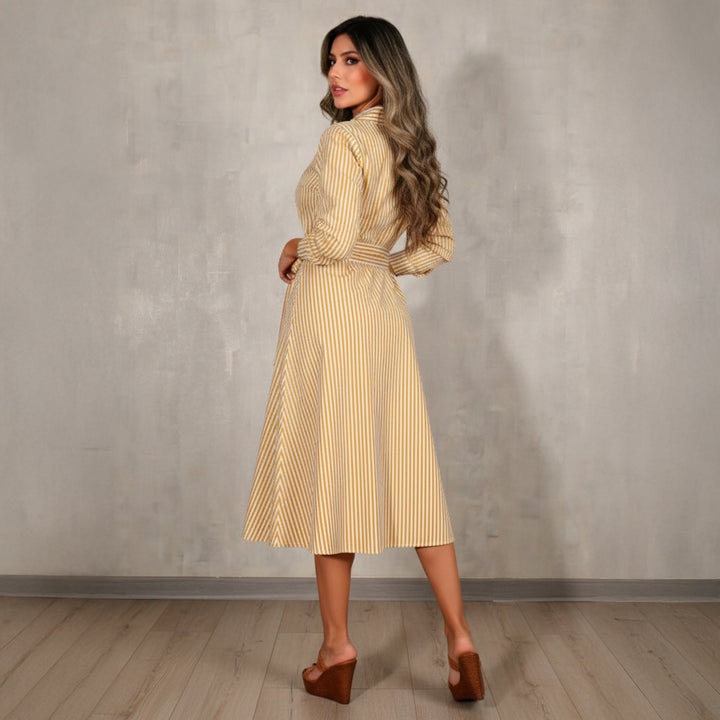 Vestido a rayas combina estilo y versatilidad con un toque de sofisticación. Confeccionado con materiales de alta calidad, ofrece un ajuste cómodo y favorecedor. Los botones frontales añaden un detalle clásico y funcional, mientras que el cinturón ajustable realza tu figura de manera elegante. Ideal para una variedad de ocasiones, desde reuniones informales hasta eventos más formales, este vestido te hará destacar con confianza y estilo en cualquier ocasión.