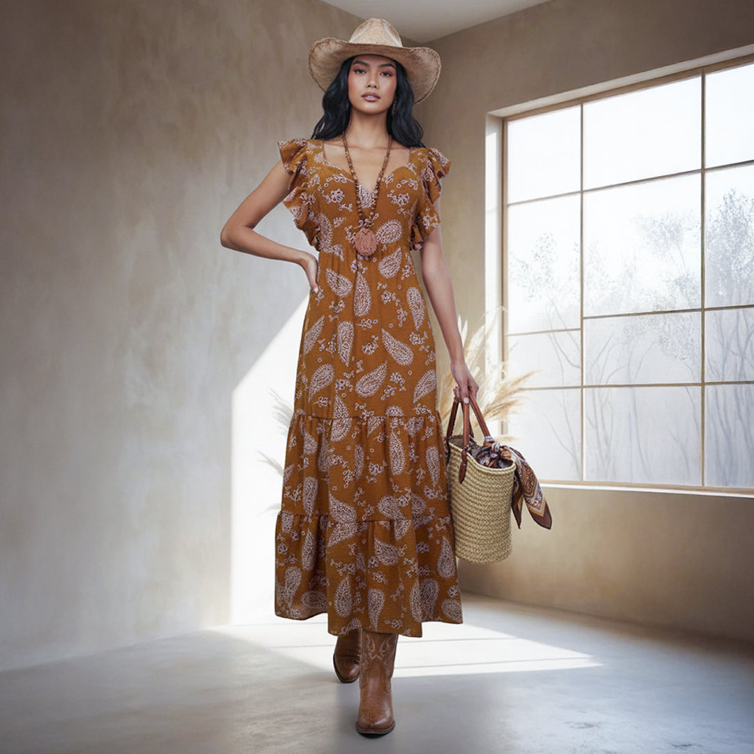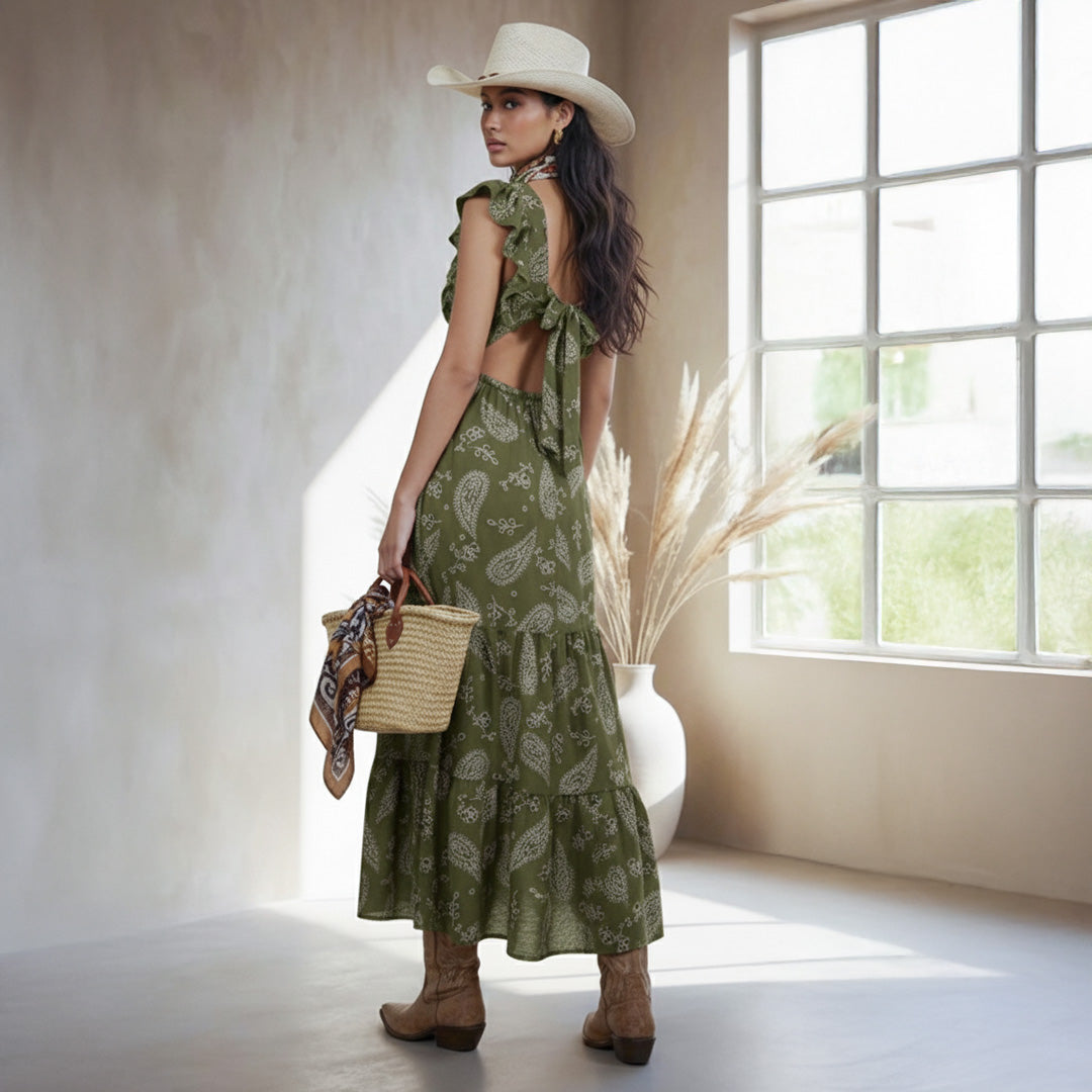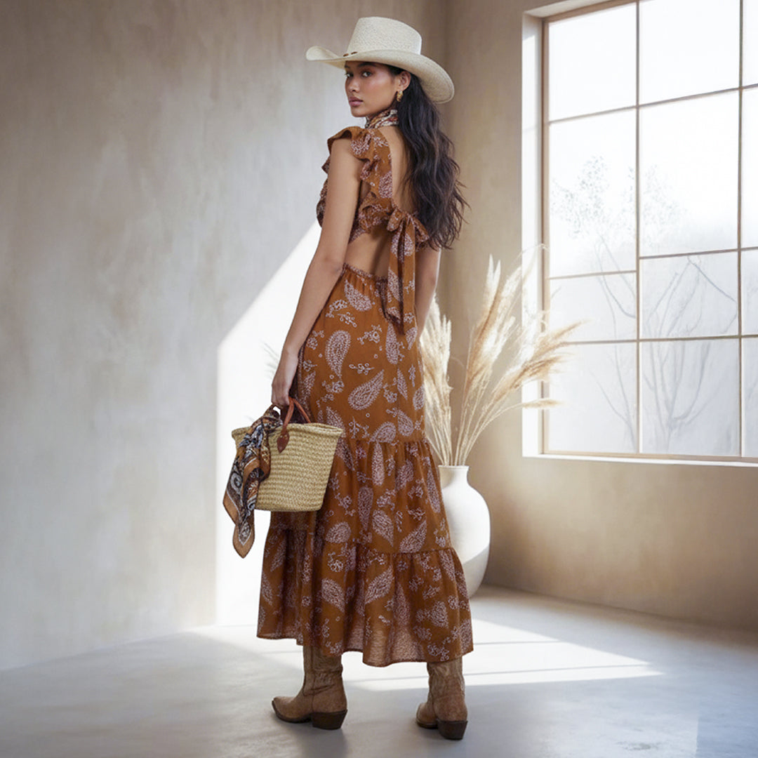 Perfecto para atardeceres en el campo, escapadas de fin de semana o eventos al aire libre donde quieras destacar con un look auténtico y lleno de estilo. Favorece especialmente a mujeres con espalda definida y espíritu libre, que disfrutan de la moda con naturalidad y gracia.