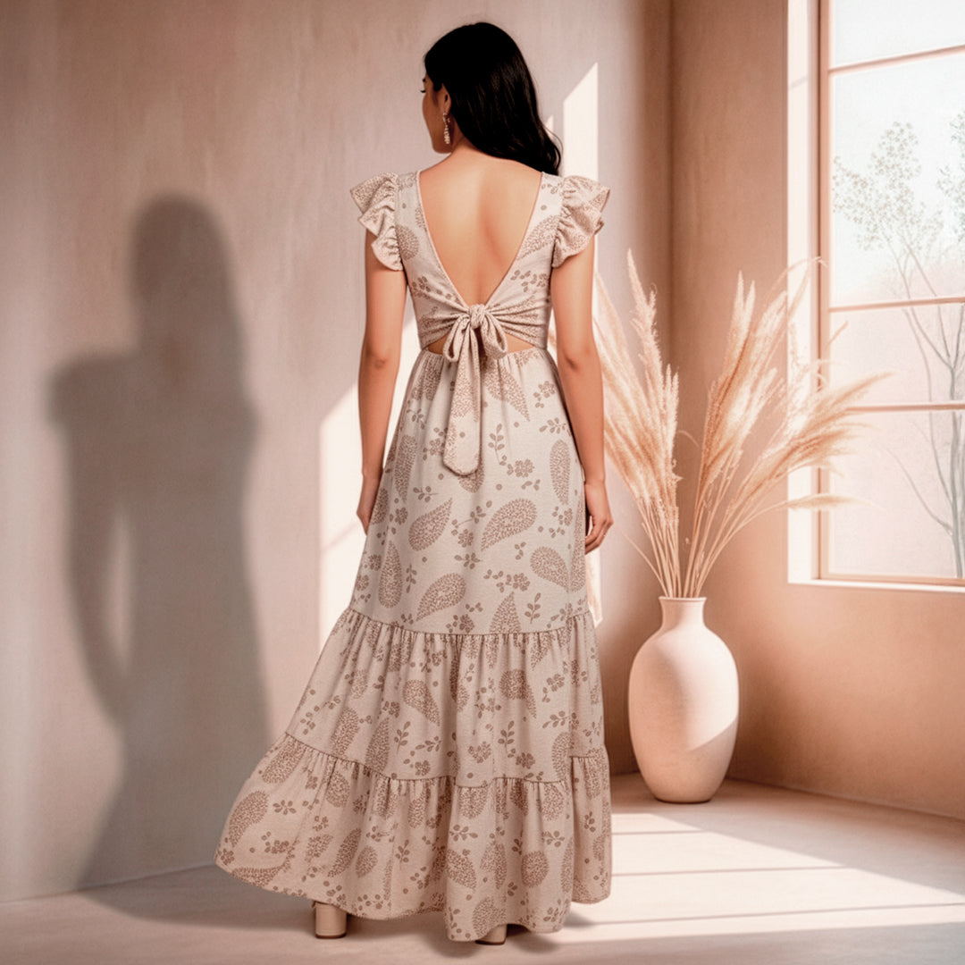 Un encanto natural que fluye con cada movimiento. El Vestido Tierra Serena está elaborado en tela chalis liviana, una fibra fresca, suave y con caída delicada que envuelve la silueta con elegancia. Su diseño largo con falda amplia y volantes aporta un aire romántico y bohemio, mientras que el escote en V y la espalda descubierta con moño ajustable realzan la feminidad y libertad del diseño.